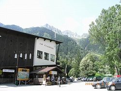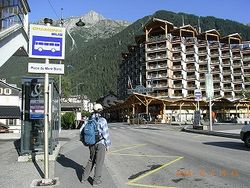 今日はアルプスの山々が映るというラック・ブランの湖を見に行く。 朝9時のバスでレ・プラ村まで行き、そこからロープウェーでフレジュールまで上がる。バスは、街を一周してから、ル・トゥール〜シャモニー間を往復している。その間にはゴンドラなどのある登山口何ヶ所かに止まる。バス停はアパートから3分ほどのところにあり、行く道にパン屋さんがあったので、焼き立てパンをお昼用に買う。 バス停には数人の登山者が待っていた。アパートを借りた時、滞在中のバスの無料パスをくれたので、バスは乗り放題だ。 | |