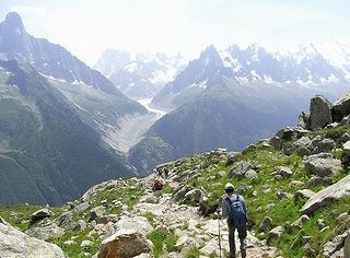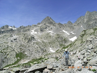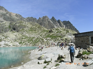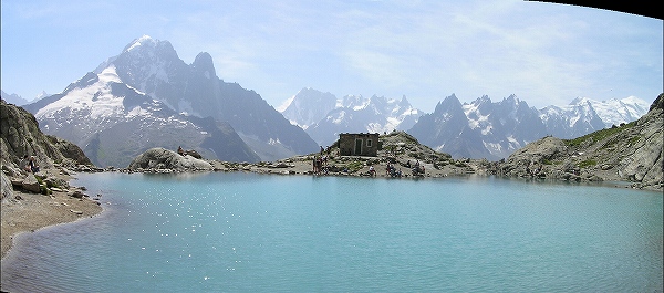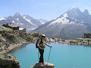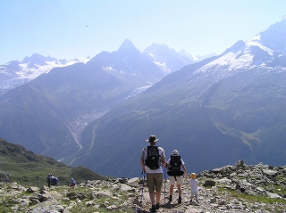 | ここはモンブラン山群を眺める絶好のポジションです。モンブランを右手に、正面にメールドグラスとその奥にグランド・ジョラス、左手にドリュとエギュ・バルトの山並みが続きます。 ラックブラン(湖)に向かって歩き始める。初めは車も通れそうな広い道だったが、すぐに石ゴロゴロの険しい下りに変わる。一緒に歩き始めた3歳ぐらいの子どもは、すぐ、ぐずってお父さんの背中に背負われた。ハイキングコースというより本格的登山道で、歩いている人も足元だけはしっかりした登山靴を履いている。3歳の子でもちゃんとした登山靴だ。 道はほとんど下りだが、急なところもあって結構けわしい。1時間ほど歩くと、フレシュールから登ってくる道と出会あう。ここから湖まで30分ほどの登りになります。 | |