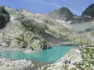 | 登り切ったところにエメラルドグリーンの湖が現れる。すばらしい景色だ。