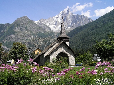 | バス停の前の温度計は13度、夏だというのに寒いぐらいだ。 9時になってもバスはなかなかやってこない。待つしかない。9時25分にやっときた。登山者で満員だ。10分ほどでレ・プラ村に着く。半分ぐらいの登山者がここで下りた。 バス停のすぐ前にかわいい教会があったが、ちょうど逆光なので撮影は帰りにして、みんなと一緒にロープウェー乗り場へ行く。 フレジュール(標高1877m)で下りると展望台があり、昨日歩いたモンタンベールと氷河が正面に見える。ここからスキー用の4人乗りリフトに乗り、ランデックス(2385m)へ上がる。 | |