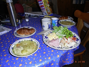 | 朝起きると雨がポツポツ降り、山は霧にかくれてなにもみえない。今日は休養することにする。この時は、2日間も歩いたしちょうどいい休養と思ったのだけど、雨は3日間も続く。休養には長すぎる雨となる。朝食は時間がたっぷりあるので、いろいろ作ってしっかりとる。 | |