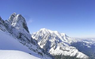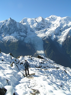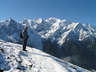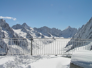 ブレヴァン展望台からは目の前にモンブラン、シャモニー針峰群、眼下にシャモニーの街、モンブランから流れ落ちるボソン氷河など迫力ある大景観が楽しめる。 しかし一面の雪で、しかも凍っている。昨日の経験で、今日は冬靴でストックも持ってきた。