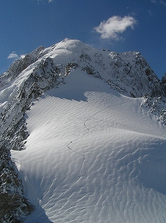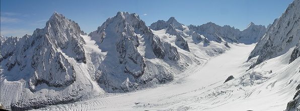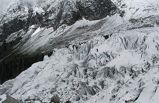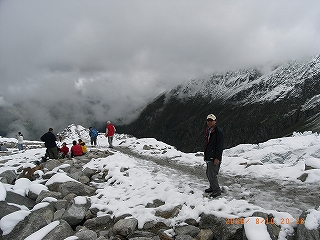 雪道とはまったくの想定外だった。 しかし氷河の末端はメール・ド・グラスとはまったく違って、クレパスの折り重なった様子はかない迫力ある風景です。 |