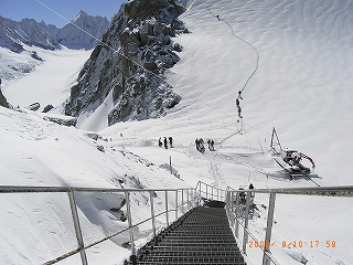 アージャンティール駅(ロープウェー乗り口)には観光客より登山者の方が多い。ヘルメット、ピッケル、ザイルをの重装備だ。エギュイ・バルト(4121mフランス最高峰)には2時間ぐらいでいけるそうだ。