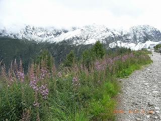 ロープウェー中間駅(1972m)から氷河のビューポイント(2338m)までは1時間30分、軽いハイキングコース、と思っていたら、途中から雪が凍って、道はツルツルだ。