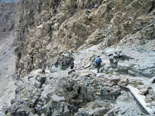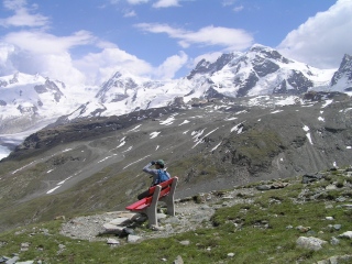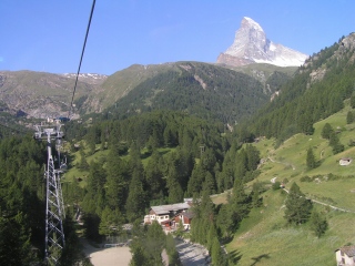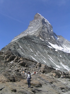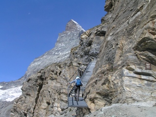 昨日1日眺めたマッターホルンに少しでも近づきたくて、マッターホルン北壁の最終登頂小屋ヘルンリヒュッテまで登ることにしました。 昨日に続き今日はお天気はよさそうです。 このコースは一般登山道ですが、しっかりした登山装備と経験のが必要です。また気軽に登れるのもお天気のいい日に限られます。 |