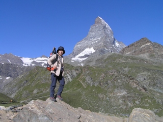 歩き始め、まずはマッターホルンをバックにはいポーズ! 道も標識もしっかりしています。 今日はお天気がいいので、ヘルンリヒュッテまで行く人も結構います。 さすがに日本人はいませんが・・・ |