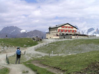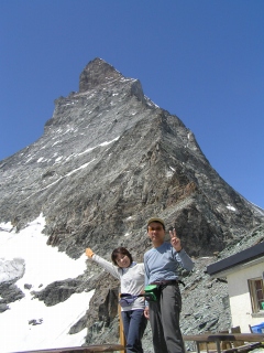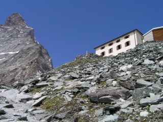 ヘルンリヒュッテ3260m やっと到着。マッターホルンに登る重装備の若い外人さんたちが数人います。 |