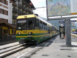 | メンリッヘンへは、登山鉄道でグルントまで1駅乗り、そこからテレキャビンで登っていきます。 グリンデルワルトから登山鉄道の路線がBOBからWABに変わり、ここで必ず乗り換えます。 |