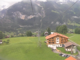 夜半かなり雨が降っていましたが、出かけるころには何とか上がっています。 天気予報を聞きたいのですが、テレビ番組もよくわからないし、だんだんよくなるだろうと勝手に予想して出かけます。 今日はフィルスト展望台からバッハアルプゼーへのハイキング予定。 グリンデルワルトの駅から奥へ10分ほど歩くと、フィルスト行きのゴンドラ乗り場があります。 | |