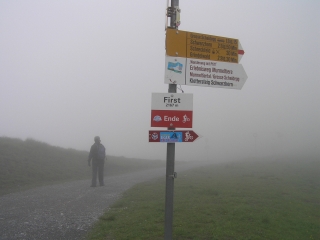フィルストに着くと、なんと真っ白です。 どちらの方向に行くのか道すらよくわかりません。 この展望台からはアイガーが真正面に見えるはずなのに(トホホ) | |
