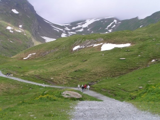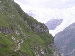 | 次第に氷河に迫りながら、ジグザグの道を登っていきます。 予想以上に急斜面でした。 やっと目的地シュティーレックに到着。左端に見えるのが小さなレストランです。 もう午後4時時間も遅いので片付けはじめていました。 |
