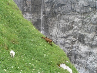 こんな斜面にヤギがいます。 鈴をつけているので、放牧されているのでしょうか。 人が来ると近づいてきます。えさがもらえると思うのでしょうか。 |