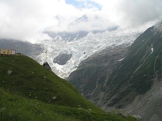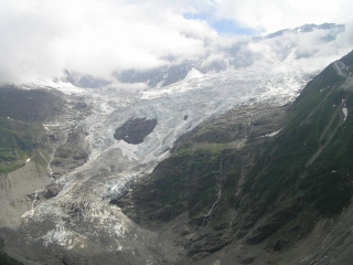 テレキャビンで下りてくると、少し明るくなり、山が見えてきたので、ボルトで途中下車。 左からウェルターホルンとシレックホルン・下氷河・下氷河です。 ![]() |