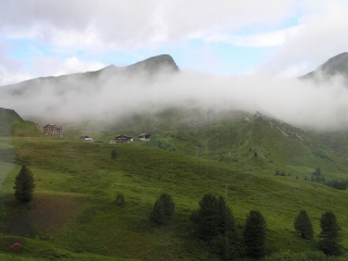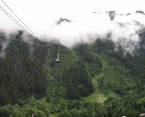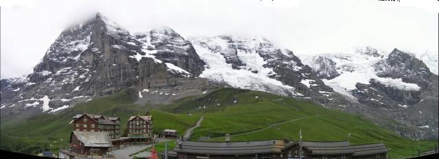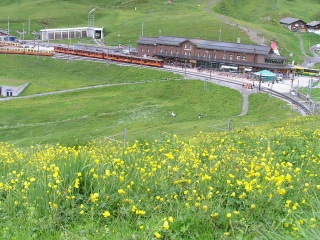 グリンデルワルトから見上げたクライネシャイデック・メンリッヘン方面です。 少し青空ものぞきますが、ガスもかかりなんだか複雑なお天気のようです。 午前中は登山電車でウロウロして、そのうちお天気もよくなるだろうと、勝手に予想して電車に乗り込みます。 クライネシャイデック駅では大勢の人がユングフラウヨッホへの電車に乗り換えて行きます。 でも山はまったくガスの中だし、お金を払って上る気にもならないので、私たちはミューレンへ行くことにします。 | |