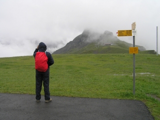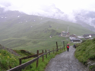 メンリッヘンに着くとなんとまたガスがやってきて、雨が降り始めました。 一緒に上がった来た人たちはあきらめて、グリンデルワルトにテレキャビン降りていきました。 私たちはしっかり合羽を着て歩き始めます。道も平坦で広いので傘をさして歩けますが、アイガーを見ながらの散策のはずが 雨で何も見えません。 | |