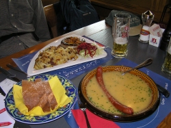 約1時間ほどで、クライネシャイデックの駅が見えてきました。 雨も多少小降りにはなりましたが、山はやっぱりガスの中です。 駅のレストランでお昼を食べてます。 ユコリンお気に入りソーセージ入りスープと、レストランのお薦めのソーセージ&ポテトを注文。 雨にぬれて冷えた体にスープがとてもおいしかったです。