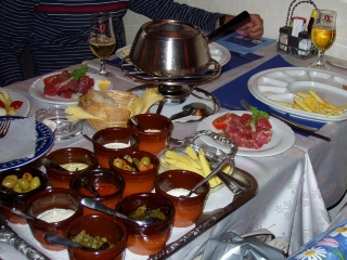 パンや洋食ばかりで飽きていたので、マグヌードルがとてもおいしく感じました。 夕食はグリンデルワルトの街の中央あたり、テラスからアイガーの見えるレストランに入りました。 せっかくスイスに来たのだから、名物ミートフォンデュを注文したら、室内でしかできないらしく、 中に案内されてしまいました。 ![]() ミートフォンデュ お肉そのままくしに刺し、をオイルの中に入れます。ソースは10種類以上の中から選びますが、ほとんどマヨネーズ味みたいでした。 外の景色は見えなかったけど、お肉はやわらかくて、たっぷり、とてもおいしかったです。 *チーズフォンデュはタマちゃんがチーズ苦手なので今回は食べれませんでした。 (ホンデュは2人以上でしか注文できません)