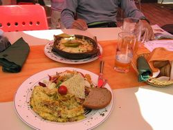 生ビール・オムレツ&ハッシュドポテト・チーズとポテトのグラタン。 どちらもおいしくて、日本の山小屋ではありえないメニューです。 でも昼もレストランで食べると、ちょっと食費がかかりすぎるな〜 ![]() | ![]() 昨日のところは、ガイドブックにのってたのにもう一つがっかりでした。 |