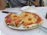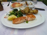今日はお庭の広いアウトサイドでゆっくりできそうなお店に入ってみました。 日本語メニューはありませんが、英語メニューなので大体の見当で注文。でもメニューの内容を読解するのにかなり時間がかかります。 お昼が遅めだったので夜は軽くピザでも。適当に注文したら上にパイナップルがのってる? 初めて食べる味だけど、酸味があってまあまあ食べれる。 でもピザの大きさにはびっくり。めずらしく残してしまった。 それとサーモンのレモンソース焼き。付けあわせに、フライドポテトかニューポテトか聞かれたので、 適当にニューポテトを頼んだ。新ジャガの丸ごとオープン焼きが出てきて、これがすごくおいしかった。