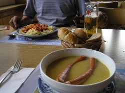 メンリッヘンのホテルのレストラン 29日お昼が簡単だったので、午後4時ごろメンリッヘンの展望台に登ったら、急にお腹がすいてきました。 展望台のホテルのレストランで食事にします。 ソーセージ入りスープとスパゲティーを注文。 こちらのソーセージは食べ応えがあります。 この日はこれが夕食になりました。 ![]() 30日:お昼は日本から持参したマグヌードル。お湯はホテルでポットに入れてもらいました。 |